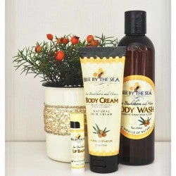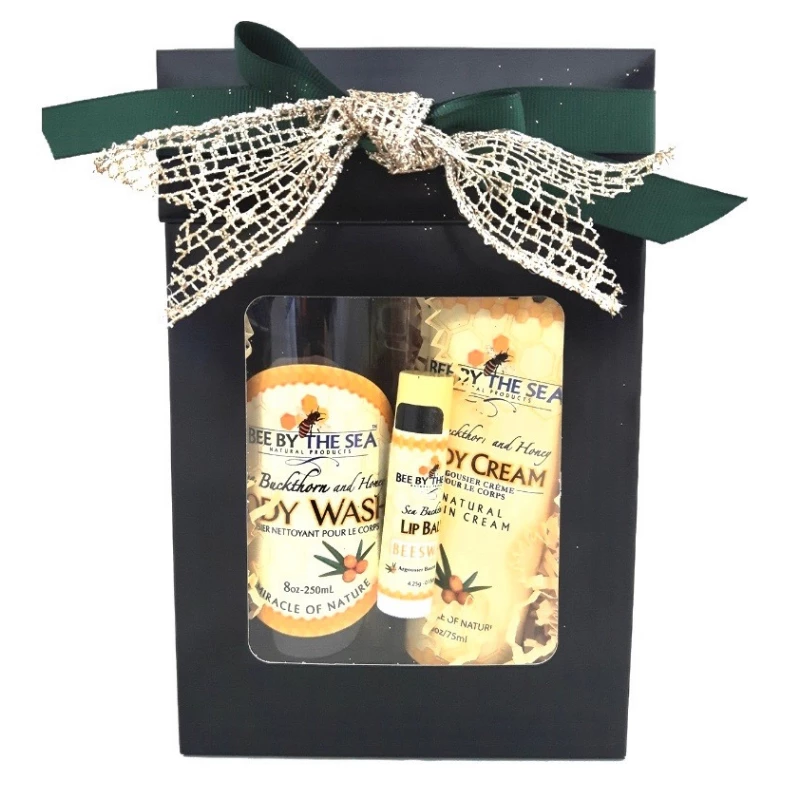 Give the gift of healthy skin with Bee By The Sea’s Indulgence Collection.  The perfect way to indulge your skin!  Ready for gift giving – these sea buckthorn & honey skincare products are beautifully packaged in a stylish black gift box adorned with an elegant sea buckthorn coloured ribbon.