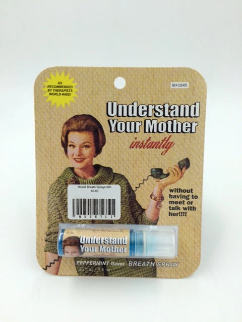 For all misunderstood children. Don’t blame your mother! Understand her. It’s easier to get even that way. Use whenever your mother has her head up her ass.Refills available..25 fl.oz. of peppermint mouth spray. Ingredients include Alcohol Denatured, Water, Glycerin, T-Maz 20, Flavor, Sodium Saccharin, FD&C Blue #1. Made in the USA.