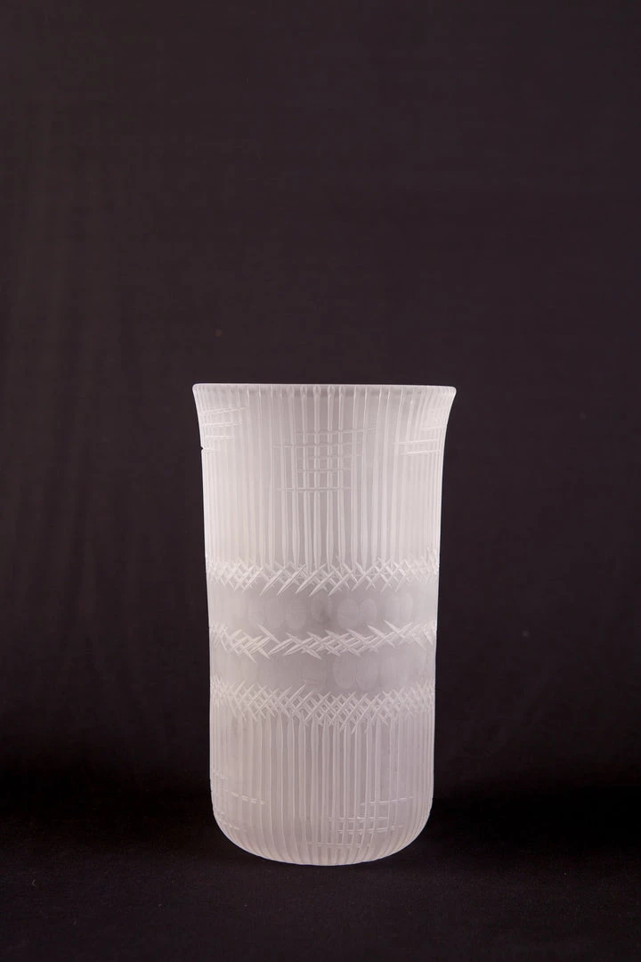 This impressive hand-blown frosted cut glass cylindrical vase stands approximately 11 inches tall and is about 6 inches in diameter. Â Signed by the artist. Â This work is accompanied by a Certificate of Provenance attesting to your ownership of an original work of art.