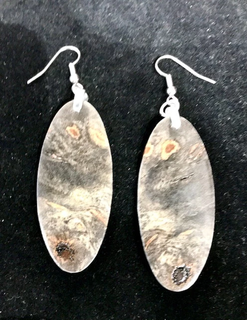 These lightweight, unique, one-of-a-kind, strikingly modern and abstract oval earrings are hand crafted from buckeye wood. Approximately 2 inches in length.