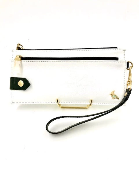 From the “One Odd Bird” luxe leather collection, this handcrafted compact but useful wristlet purse has four separate compartments and a built-in card holder to help you organize your personal necessities. White with black trim for a stunning smart casual look.
