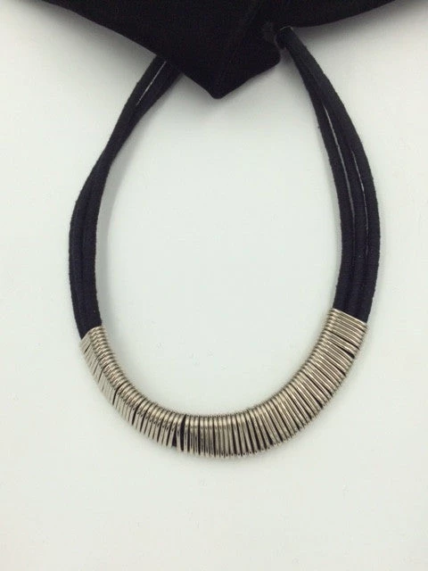 An understated and elegant necklace simply composed of three black cotton strands wrapped with individual metal bands. Necklace is approximately 19 ” long and has a simple lobster clasp closure.