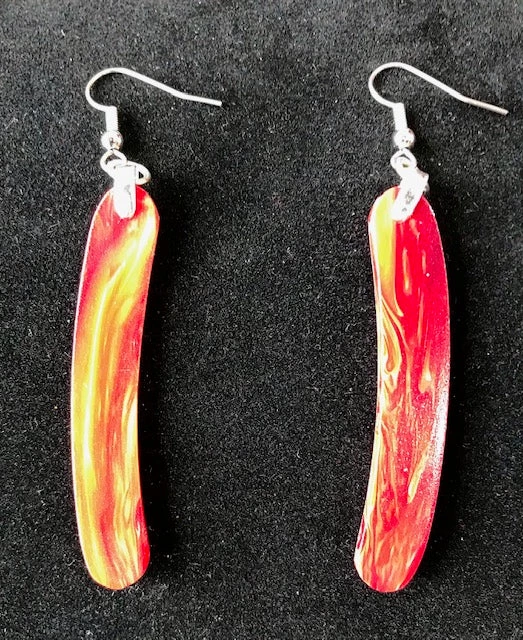 These lightweight, unique, one-of-a-kind, strikingly modern and abstract crescent shaped earrings are hand crafted from recycled bowling balls. Approximately 2 and 1/8 inches in length.