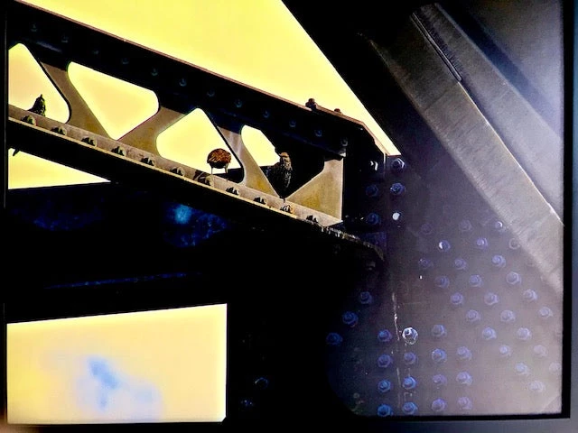 This brutalist photograph, primarily in grays and yellows, will beguile you with its juxtaposition of little birds roosting on a massive iron beam. Framed (approximately 21″ by 17″).