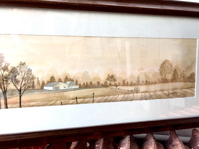 This sepia toned watercolor painting will visually transport you to the countryside of the heartland with a white barn as its focal point. Framed (approximately 27″ by 14″). Signed by the artist.