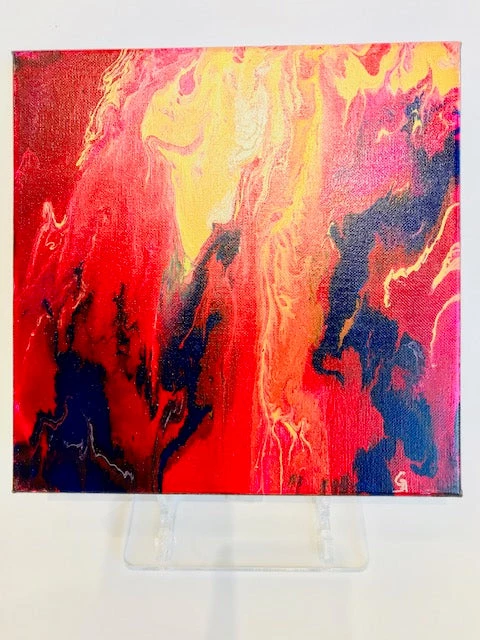 A fiery piece dominated by reds. yellows and purples, this little (10″ by 10″ frame wrapped) masterpiece deserves a spot in your casually modern home. Signed and dated by the artist.