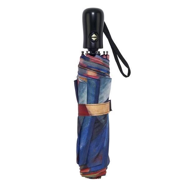 This striking compact folding umbrella (when folded it is only about 12 inches long) has an auto open /close mechanism, unbreakable fiberglass ribs, and a 100% polyester pongee waterproof cover. The faithfully rendered graphic of Franz Marc’s famous painting “Stables” is produced using advanced 3D printing technology to achieve particularly clear images. When open, the umbrella has a 48 inch diameter. Umbrella comes packaged in an attractive gift box.
