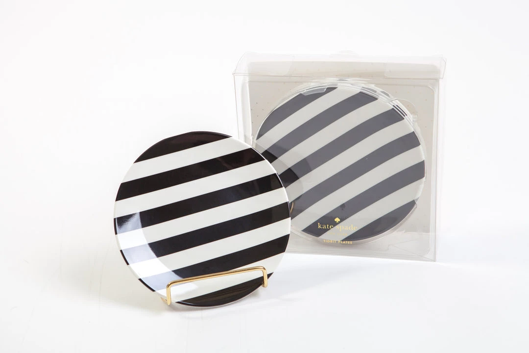 6 inch (diameter) solid melamine tidbit plates, in the black stripe pattern (shown) and the black dot pattern (not shown). Â Plates are bpa-, phthalate-, and lead-free. Dishwasher safe.