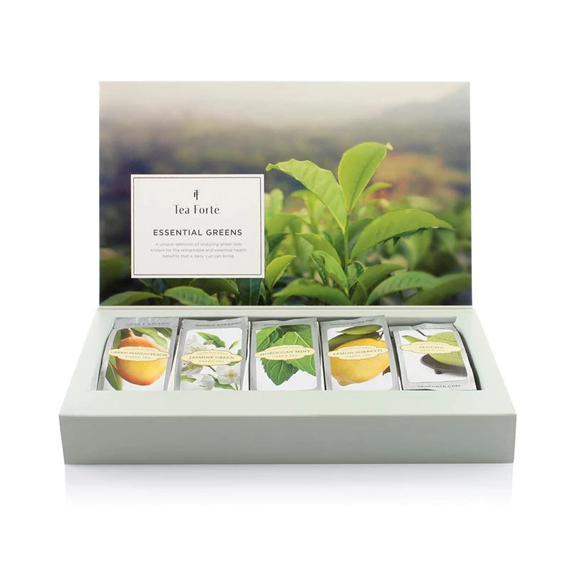 We offer Essential Greens “single steep” selections of pre-portioned loose leaf tea packets designed to be used with the tea infuser that accompanies every “Kati” steeping cup. There are five different Essential Greens tea blends included in the collection: Green Mango Peach (organic), Jasmine (organic), Lemon Sorbetti (organic), Moroccan Mint, and Sencha (organic) teas.
