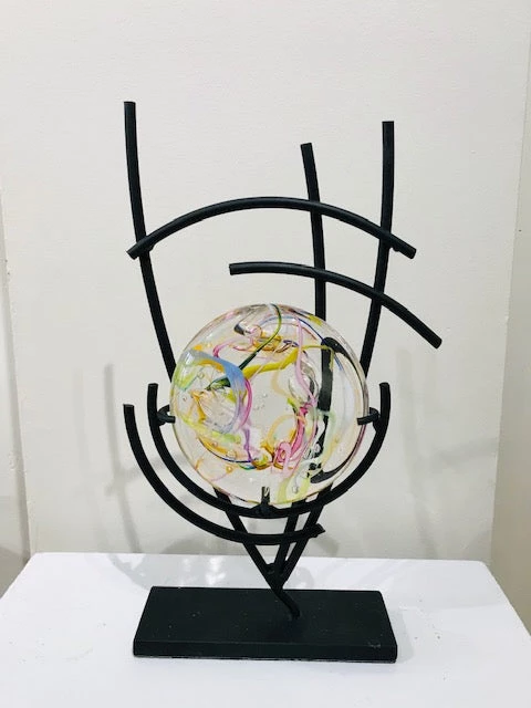 This stunningly seductive abstract hand-blown art glass sculpture is comprised of a clear blown glass disk infused with sinuous threads of color and suspended on a wrought iron “art deco” style frame also crafted by the artist.  The piece measures approximately 14 inches high, 8 inches wide and 3 inches deep.