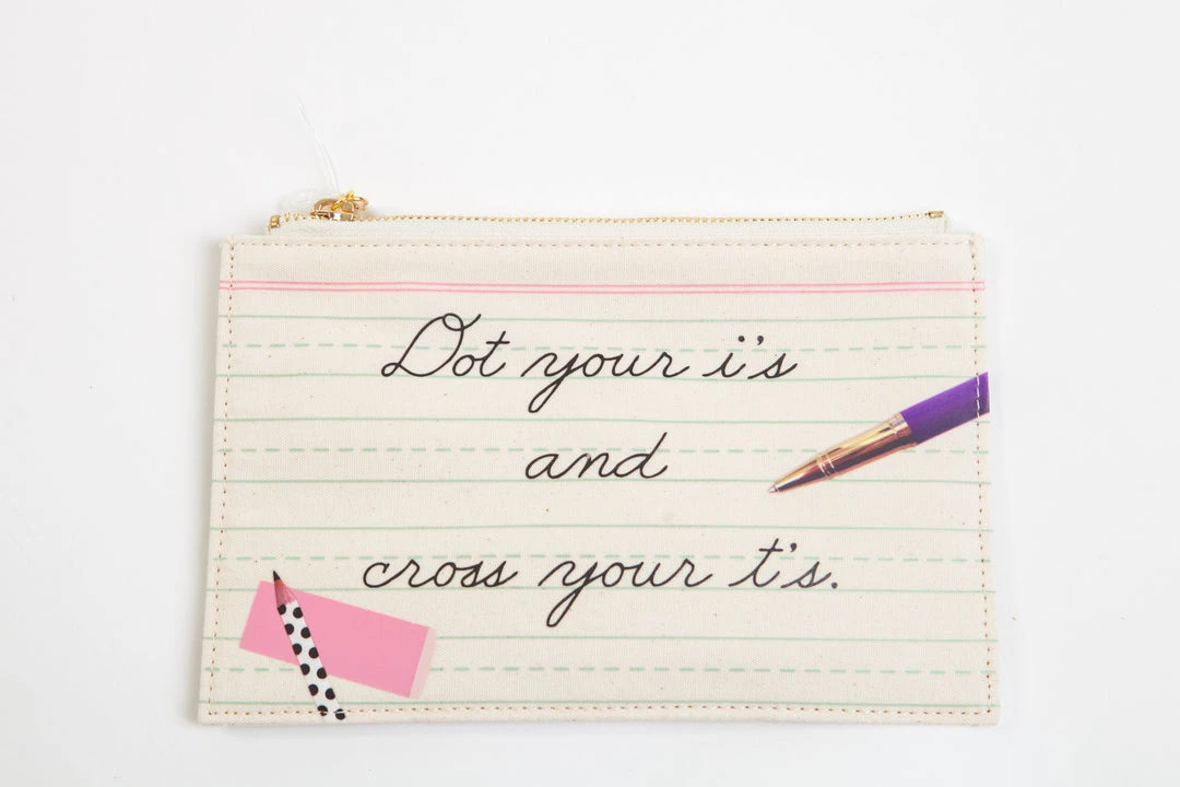 This canvas cloth pencil pouch with the wise advice comes well equipped with two Kate Spade New York (KSNY) pencils, a pencil sharpener, eraser and ruler. Â The pouch is 8 and one-half inches wide and 5 and one-half inches high and includes a zipper pull with the iconic KSNY logo.