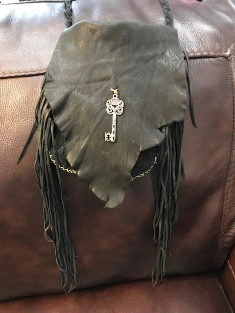 If you want a little more drama and excitement in your purse, you can select this beautiful black supple deerskin bag with fringe. The fringe gives it a wisp of cowgirl country charm. In addition to the fringe, the bag sports a decorative (and inviting) “key” on the front flap. The bag measures approximately 7 inches wide and 8 inches high and has one compartment. Handmade and hand-stitched by Findlay, OH artist Kimberly Vaughn.