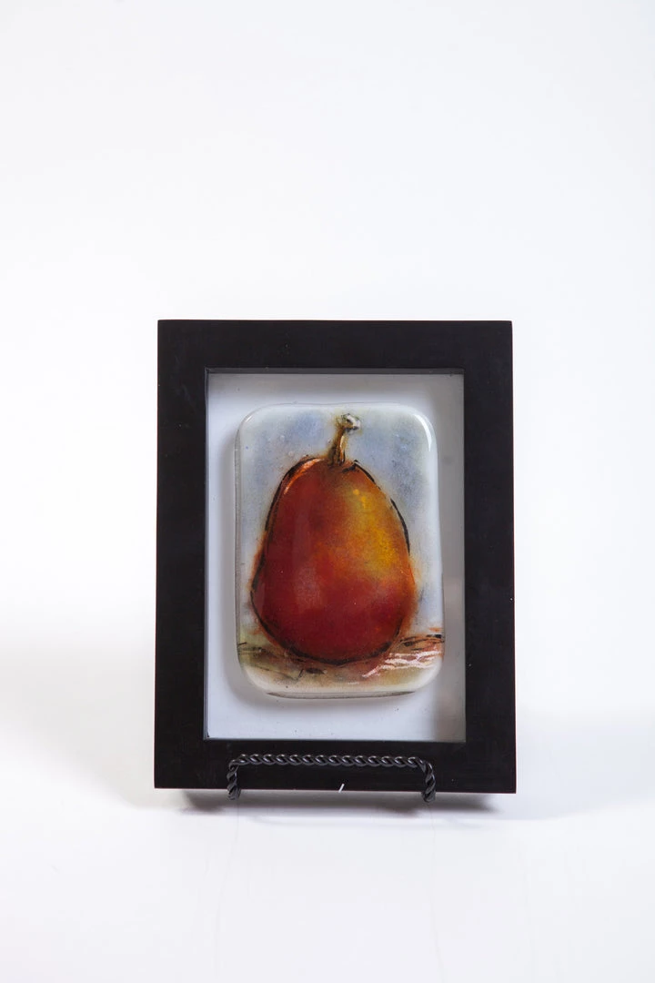 In the classic tradition of a Renaissance still life painting of fruit, this enamel and fused glass picture of a red pear brings the fruit to life with its depth of field, giving the viewer the sense that the three-dimensional pear could be picked up and eaten. Â The picture measures about 3 and three-quarters inches by 5 and one-quarter inches and is mounted on the frame glass (which now serves as a backboard for the picture) with Velcro. Â The frame itself measures approximately 6 and one-quarter by 8 and one-quarter. Â This picture is accompanied by an official Certificate of Provenance issued by The Collector Gallery at Objects of Desire Artful Living attesting to your ownership of an original work of art. Â