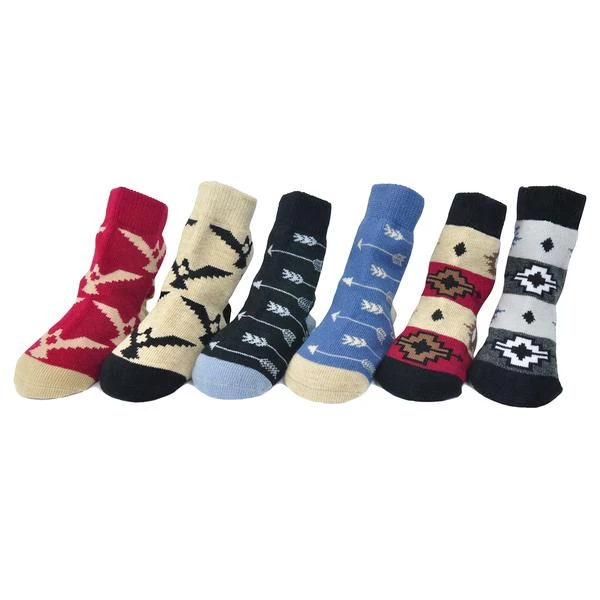 Each cute box contains 6 pairs of organic “Carlsbad” Native American design organic socks (70% organic cotton, 23% polyester, 5% nylon, and 2% spandex). Tested to ensure that the socks are free from phthalates and lead. Available in 0-12 month and 12-24 month sizes. All pairs are covered by the exclusive Me in Mind “Lost Sock Guarantee” (email the company for a free replacement in case of a lost sock-details in each box). All socks have a rubberized, slip-resistant “Me in Mind” logo or saying on the sole.