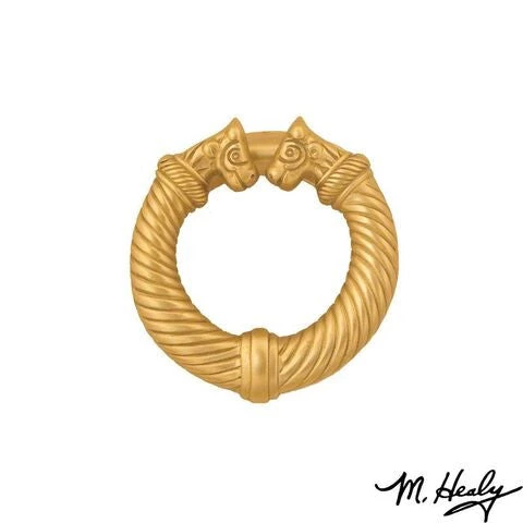 The artistic process unfolds like this: he first sketches his idea, then he sculpts it into a three-dimensional model which he uses to make an impression (or mold) of the model in fine sand. Â He then pours a molten metal (brass, bronze, or nickel silver) into the mold. After the metal cools, the sand is broken away from the raw metal casting which is then subjected to multiple phases of grinding and polishing, adding accents and highlights to each piece or art. Â Each piece of decorative hardware requires its own unique mold, as each mold is destroyed in the process of making each piece. Â Finally, the almost-finished door knockers receive a baked polyurethane finish similar to the clear coat finish on your car to provide years of protection. Â Each piece is also signed by the artist.