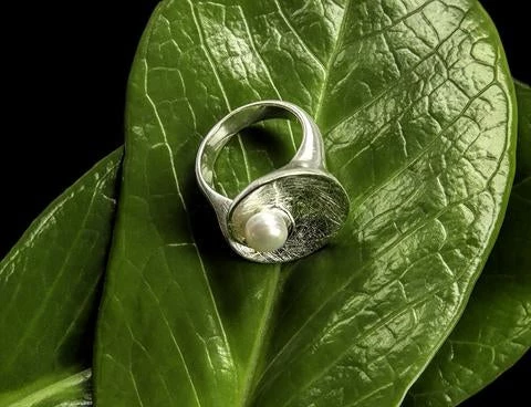 You will proudly wear this strikingly modern .925 sterling silver ring which is graced with a dazzling and beautifully mounted pearl. Crafted by native artisans in Bali. A certified Fair Trade item.