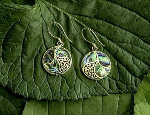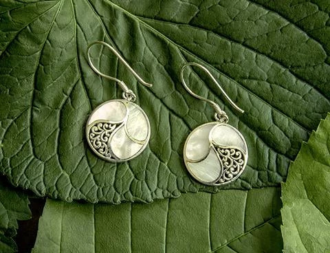 Wear a bit of tropical paradise when you put on these beautiful .925 sterling silver earrings with their luminescent abalone or mother-of-pearl insets gathered from the warm tropical seas surrounding the island of Bali. They are exotic and classy at the same time as exemplified by the hint of the ying-yang-like design hand-crafted by native artisans utilizing their historic cultural motifs. A certified Fair Trade item.