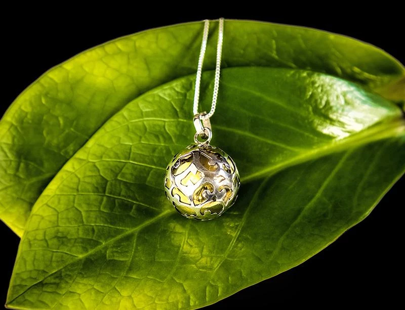 Each Dream Ball is an intricately designed .925 sterling silver pendant containing a brass bell that softly chimes, evoking a sense of overall calm and tranquility. This Dream Ball is distinguished by the delicate silver filigree scrollwork surrounding a brass inner ball.There are two special traditions in the Balinese culture with respect to giving Dream Balls as gifts. One tradition is that the Dream Ball represents timeless friendship. The other is when presented to an expectant mother, the Dream Ball’s gentle chiming is believed to help soothe and relax both the mother and her unborn child. These Fair Trade treasurers are designed and handcrafted by talented artisans in Bali with generations of skill and knowledge. The Dream Ball comes with an 18 inch silver chain. A 30 inch black cord is also available as an alternative to the silver chain.