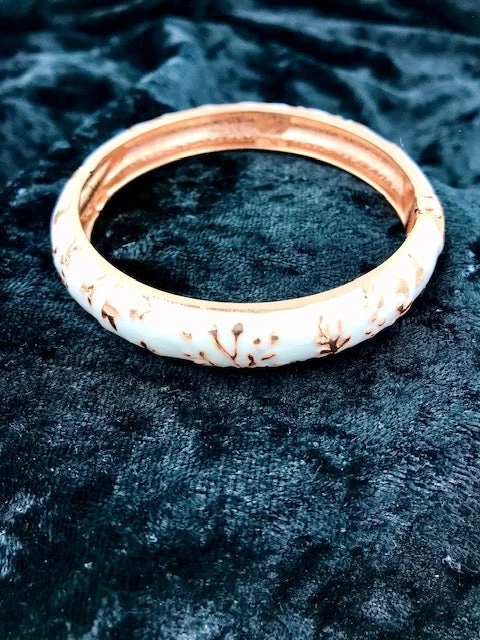 Crafted in the style of cloisonne bangles, these high-quality and richly enameled bracelets feature delicate raised floral designs. Golden leaves adorn the White and Black bracelets while colorful leaves and blossoms are featured on the Red and Green bracelets. “Easy on” spring hinged closure fits most wrists. At this price get more than one!