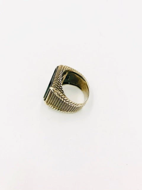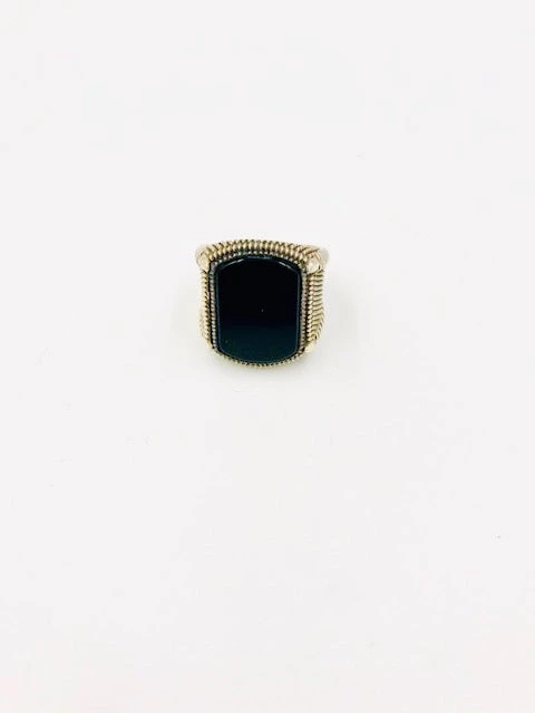 Handsome ring with large onyx stone set in an intricately rendered silver band in size 9.5