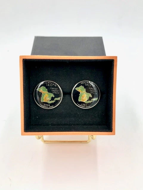 If you live in Michigan, or just love the state, these beautiful hand-painted 2004 Michigan statehood quarters with the great lakes pictured are the cufflinks for you!