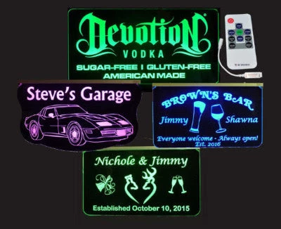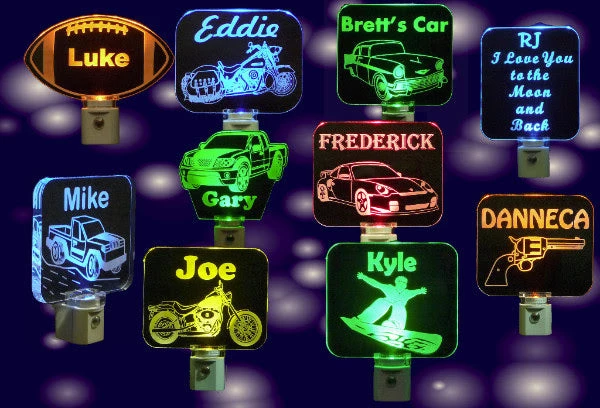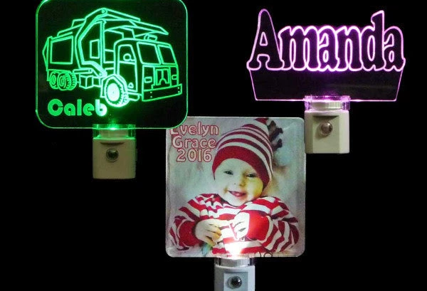 These incredible LED lit signs and night lights can be completely customized to your wishes. The night lights can be just text (with or without color), text and a drawing (with or without color), or they can feature a picture. Night lights can be lit with a variety of different alternative LED colors including white, red, green, blue, yellow, gold, etc.