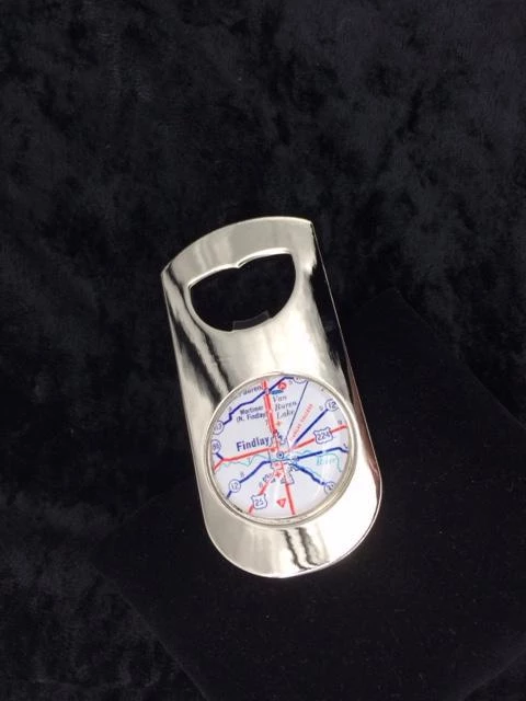 Sleek stainless steel bottle opener with a vintage map highlighting Findlay, Ohio featured in the shank. A very classy addition to anyone’s kitchen or bar. Customized maps for other communities in the USA are available upon request.
