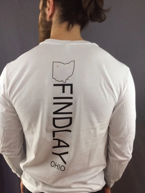 These substantial 100% ring-spun cotton long-sleeve T-shirts sport an original art print of a flower in greens and blues painted (and signed) by Kristen Dukat. Findlay, Ohio is printed vertically on the back of the shirt crowned with an outline map of Ohio with a red heart where Findlay is located. An original and exclusive design for Objects of Desire Artful Living.
