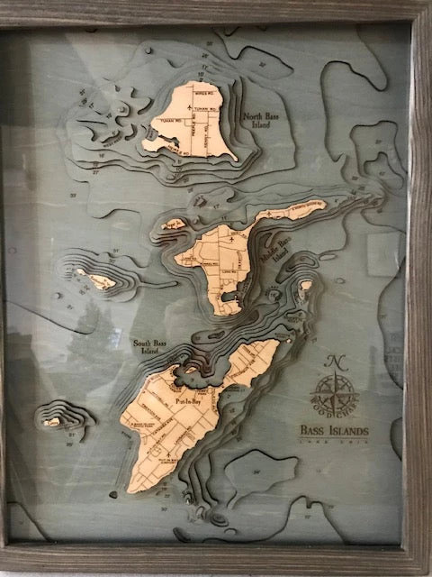 Beautiful and accurate wooden topographical map of the Bass Islands in Lake Erie, including Put-in-Bay. A heirloom treasure.