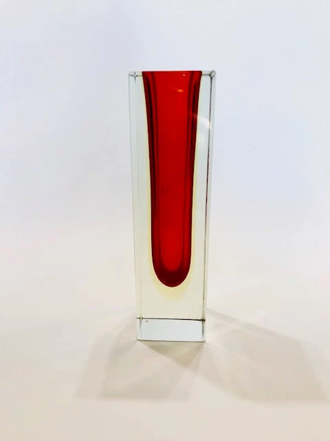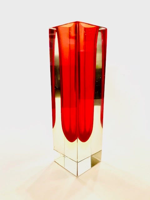 This eye-catching square crystal bud vase with red interior stands just a little over 6 inches high and is approximately 1 and 3/4 inches on a side.