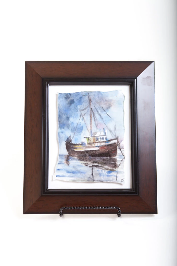 A classic picture of a fishing trawler at anchor on a foggy morning, this glass “wafer” picture is made using fine frit which is annealed  in a ancient process of making colored glass (dating back to at least 1662) with enamels.  The piece is signed by the artist and measures approximately 6 and one-quarter inches by 8 and one-half inches without the frame.  The frame measures about 12 and one-quarter inches by 14 and one-quarter inches.  This picture is accompanied by an official Certificate of Provenance issued by The Collector Gallery at Objects of Desire Artful Living attesting to your ownership of an original work of art.