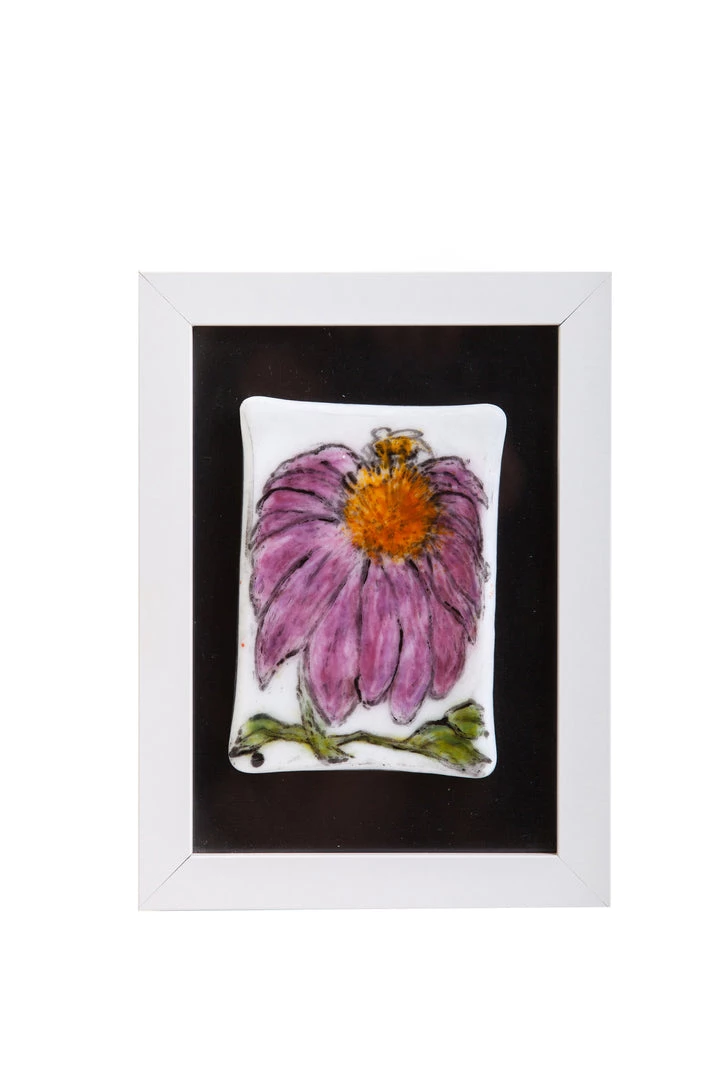 This fused glass and enamel picture tribute to the Echinacea (perhaps better known as the Purple Coneflower) is approximately 3 and one-quarter inches by 4 and one-half inches and is attached to the frame glass with Velcro. Â The frame is about 6 inches by 8 inches. Â This picture is accompanied by an official Certificate of Provenance issued by The Collector Gallery at Objects of Desire Artful Living attesting to your ownership of an original work of art. Â