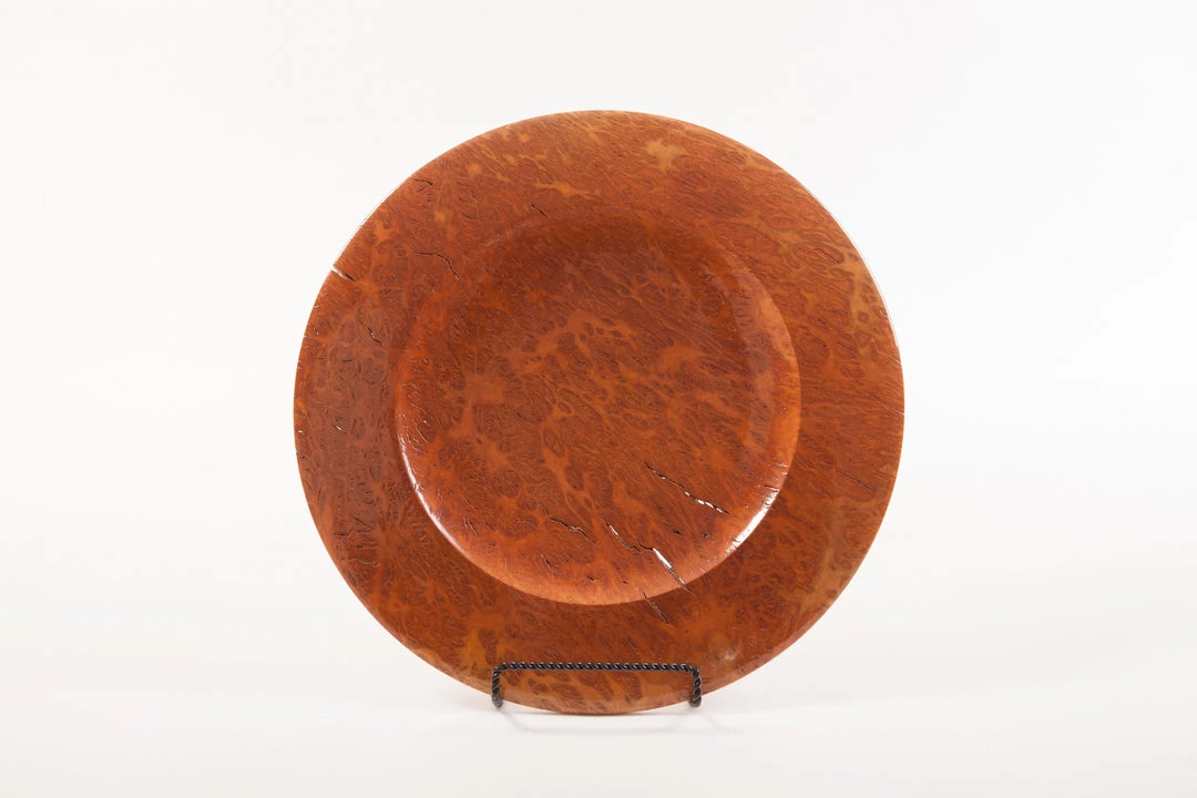 This extremely impressive (17 inches in diameter and weighing more than 4 pounds) reddish-brown burl wood platter crafted from a single large burl from the fascinating yellow box tree in Australia exhibits all of the characteristics that make burl wood so inviting to wood turners. Â The surface of the platter is covered by patches and swirls which clearly show how irregular is the wood grain in a burl. Â Its rustic quality comes from the cracks in the wood (some of which extend completely through the platter) which is also characteristic of burl. Â The yellow box tree is famous for its unique ability to protect itself from “predator” insects by altering the genetic makeup of its leaves, thus changing their smell and making them less attractive to the various insects that like to feed on them. Â The platter is signed and numbered (#2933) by the artist.