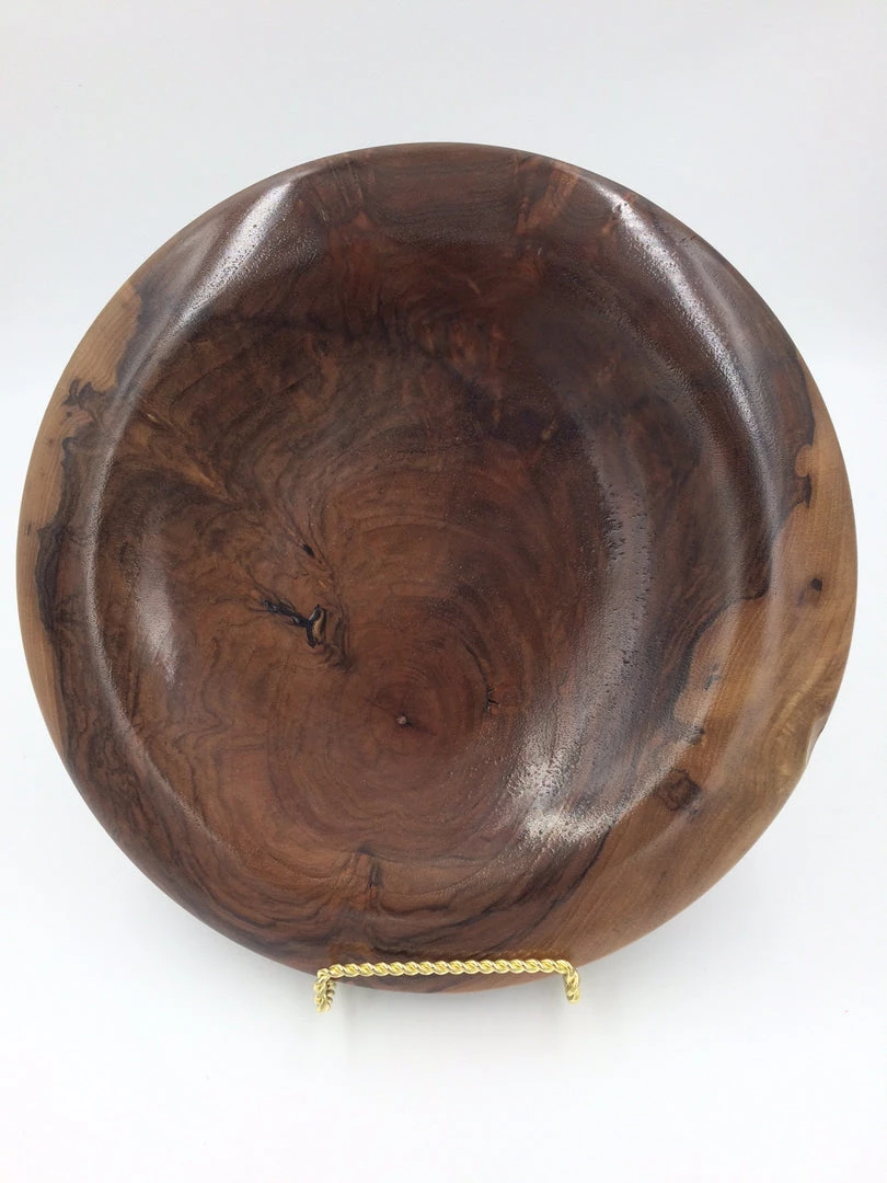 This darkly handsome shallow burl wood platter is almost 12 inches in diameter. Â It is signed and numbered by the artist and is accompanied by a Certificate of Provenance attesting to your ownership of an original work of art.