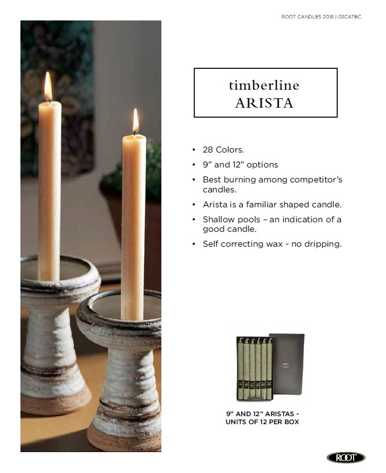 Root 9″ Arista dinner candles with a Timberline finish have an elegant, formal look because of their height and trim profile. The streamlined diameter (7/8 of an inch) virtually assures a clean, even burn which eliminates drips. The base is compatible with most candle holders. The Timberline finish is a subtle variegated look that is very attractive. Â Burn time is 1.5 hours per inch, or a total of about 13 hours.