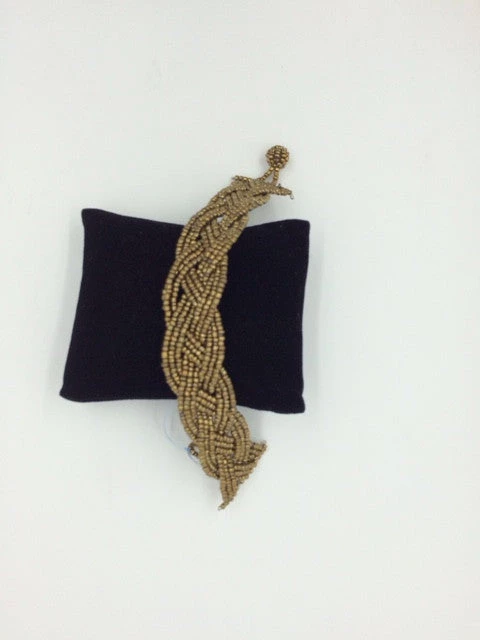 A stunning plaited bracelet made of interwoven strands of bronze beads. Bracelet is approximately 8 inches from end to end and about 1 inch wide. Closure is a simple ball and loop.