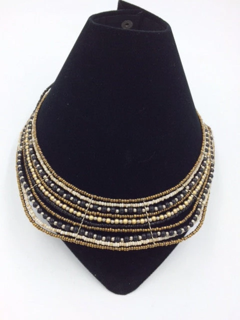 An elegant and eye-grabbing “dressy” necklace composed of strands of seed beads in a variety of gold metalic and natural finishes interspersed with strands of slightly larger beads in black, silver and gold tones. Â Necklace is approximately 22 inches long and has a simple lobster clasp closure.