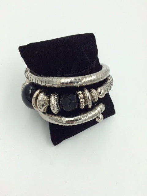 A striking and attention-getting coiled bracelet composed of shiny silver-toned disks and articulated silvery coils interspersed with black faceted and egg-shaped balls.Â