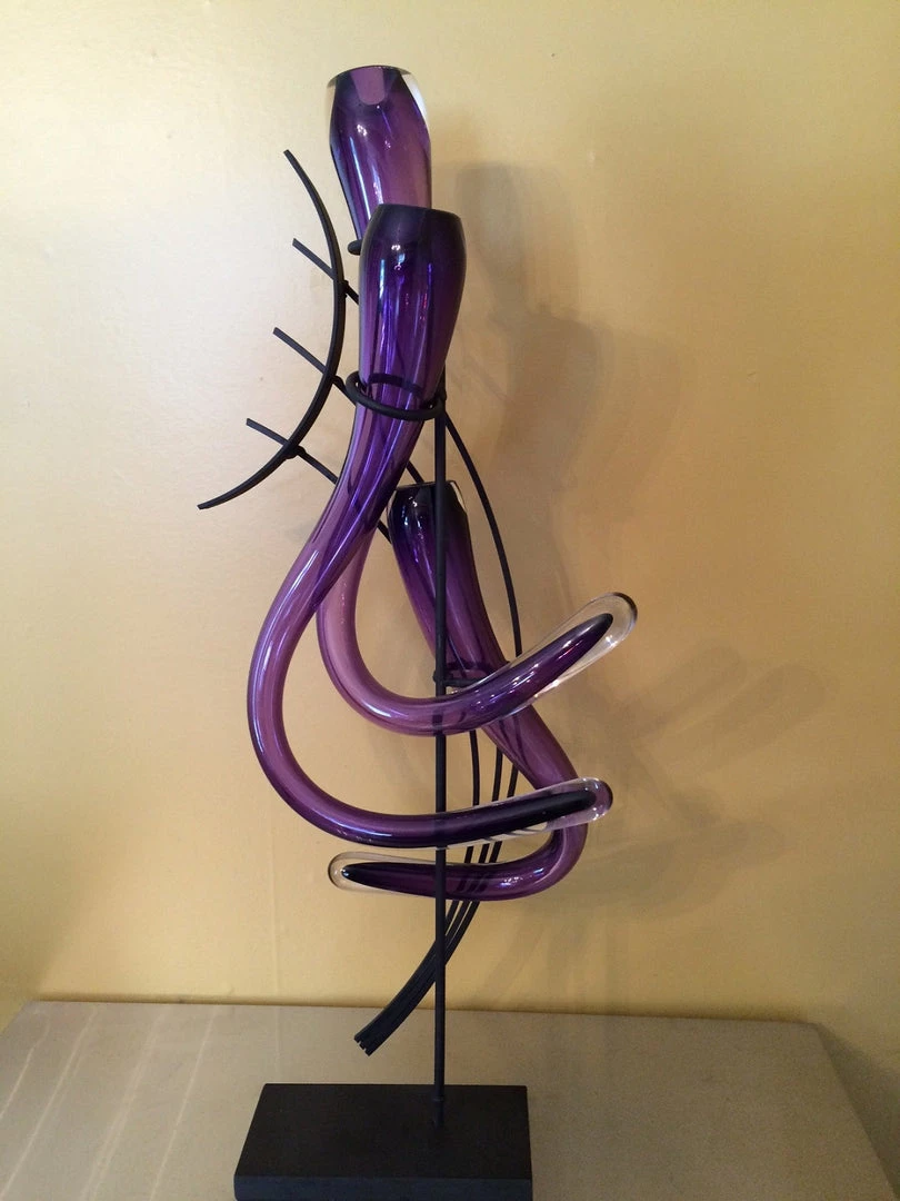 This stunningly original abstract hand-blown art glass sculpture is comprised of three sinuous hollow clear blown glass tapered tubes infused with a deep purple color and suspended on a wrought iron “art deco” style frame also crafted by the artist. Â The piece measures approximately 29 inches high, 11 and 1/2 inches wide and 5 and 1/2 inches deep.