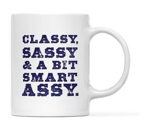 People will think twice about using YOUR “Sassy” coffee or tea mug! Or, gift it to that person in your circle of acquaintances who would be the perfect recipient of this distinctive cup that proclaims “Classy, Sassy and a bit Smart Assy”