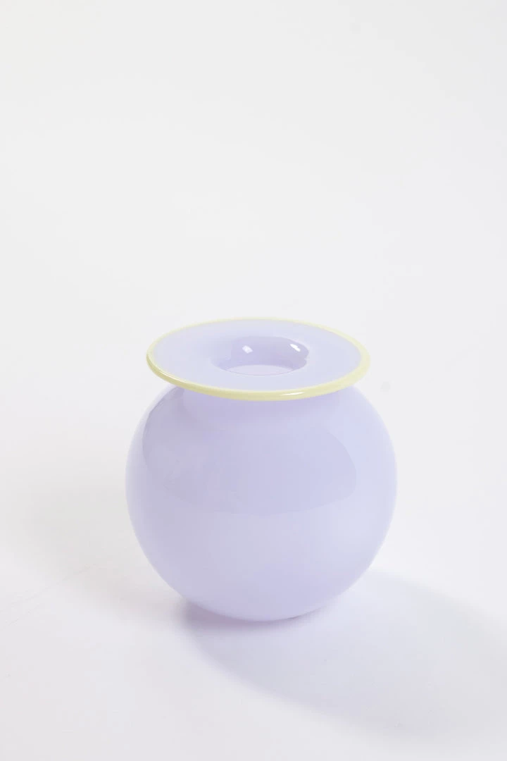A husband and wife team (Boyd Sugiki and Lisa Zerkowitz) create these classically beautiful hand made and hand blown round vases in subtle and joyful colors reminiscent of those of the beautiful gerbera daisy.  Vase is about 4 and one half inches high and 4 and one quarter inches in diameter. Since each piece is a collaboration between Boyd and Lisa, rather than an artist’s signature each piece is signed “Two Tone Studios”.