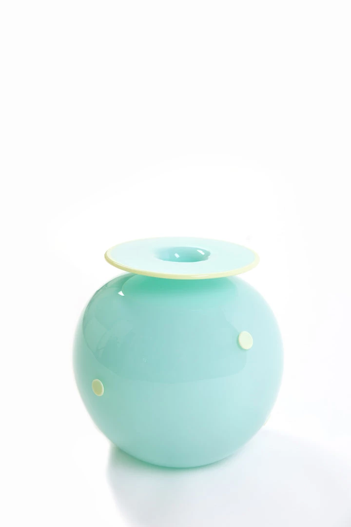 A husband and wife team (Boyd Sugiki and Lisa Zerkowitz) create these classically beautiful hand made and hand blown round vases in subtle and joyful colors with fun round dots and rim trim in complimentary creamy white. Â Vase is about 8 inches high and 7 inches in diameter. Since each piece is a collaboration between Boyd and Lisa, rather than an artist’s signature each piece is signed “Two Tone Studios”.