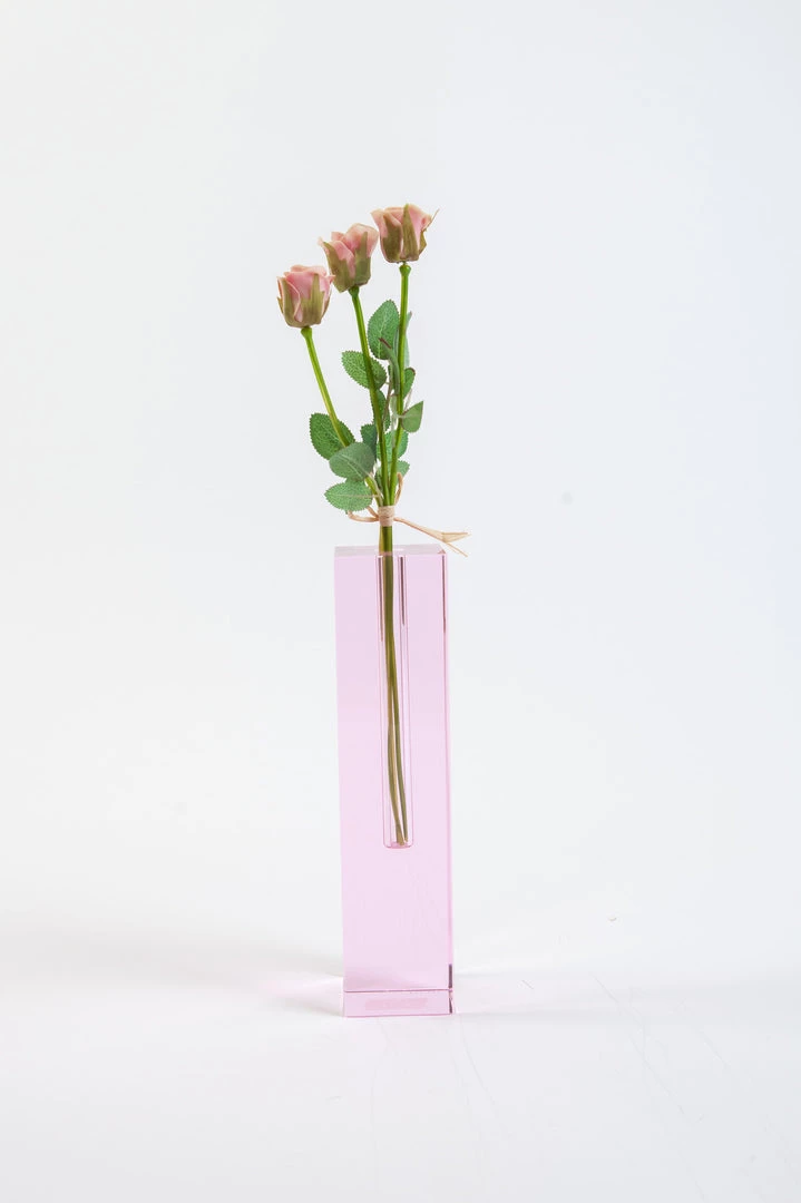 Made from the highest clarity glass, this delicate rose colored crystal glass bud vase is cut, etched and polished by hand, giving it an exquisite sparkle that brings light to a room. Â The vase stands 10 inches tall and is 2 and one half inches square. Â The flower stem hole extends 6 and one half inches down into the square glass vase and is about five eights of an inch in diameter. The heavy bud vase rests on four small pads to protect the vase and any furniture it may be placed on.