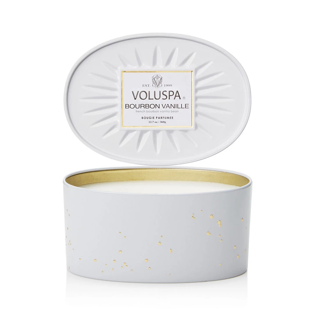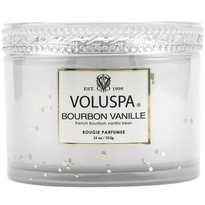 Voluspa is an ethical luxury brand scented candle that comes in a beautiful frosted glass container with gold flake highlights. This is one scented coconut wax blend candle that you will be proud to incorporate into your table top decorations. The scent, Bourbon Vanille, is a delightful combination of bourbon and french vanilla bean, a particularly delightful scent during the Holidays but soothing and delightful at any time of the year. The 11 oz. (45 hours burn time) dual-wick candle comes in a beautiful silver presentation box.